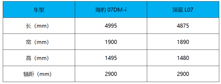 首先来看尺寸规格,海豹07DMi要略大。4995/1900/1495mm的三围尺寸,外加2900mm的轴距,视觉上要更显大一些。但深蓝L07其实也不小,4875/1890/1480mm的三围,外加2900mm的轴距。从车宽和轴距看一摸一样,两台车其实是一个级别。
