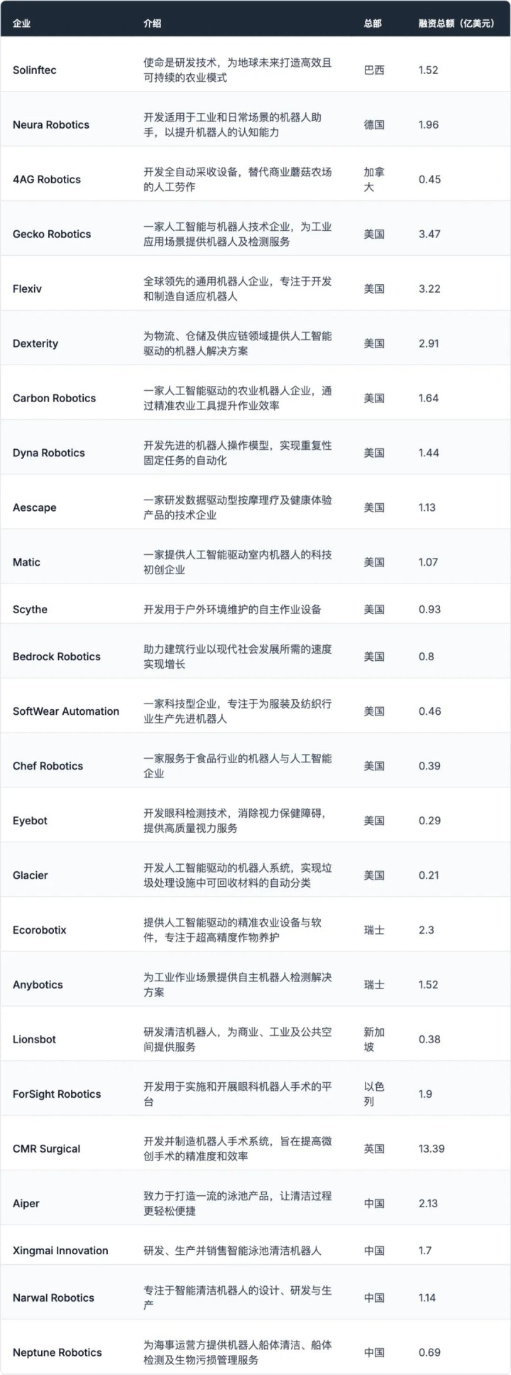 ● 而在中国,清洁机器人依然是重点方向。Aiper、星脉创新、云鲸、Neptune Robotics等公司都在做智能清洁或水下机器人,总融资超过5亿美元,中国在生活服务和特种机器人上的竞争力。